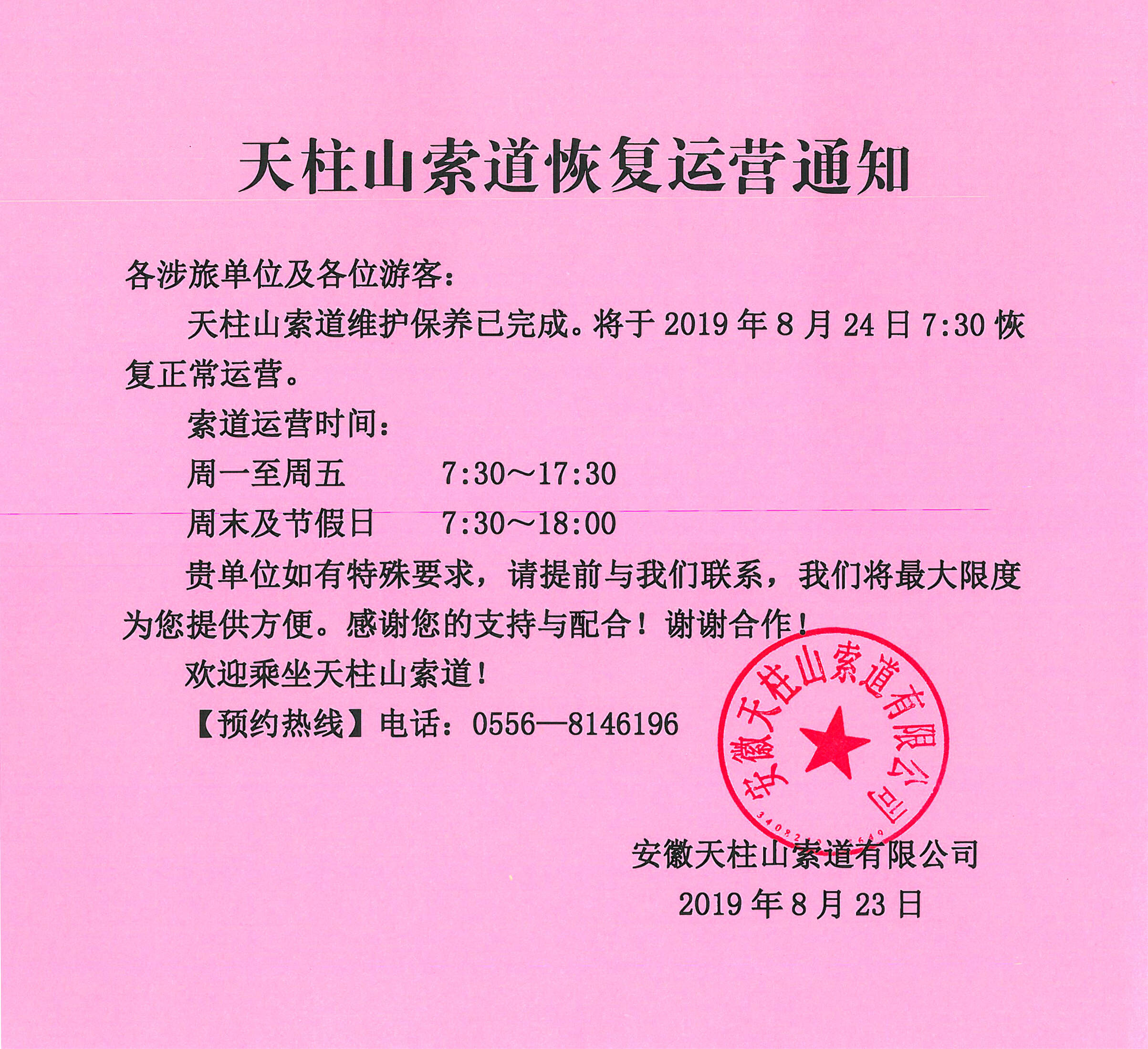 关于天柱山索道恢复运营的通知