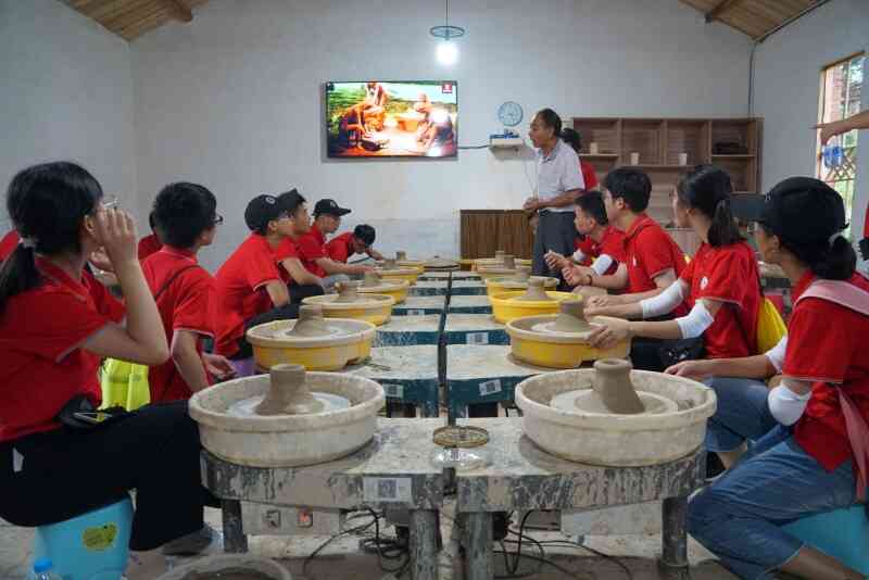 潜山市痘姆乡素有“千年陶瓷之乡”的美称,陶器手工技艺距今已有6000多年的历史,堪称制陶史上的活化石。走进痘姆古陶,首先映入眼帘的是建于清代的龙窑,每个入火口都堆积了许多柴火,近处可感受到火的炙热温度。走进屋内,可见众多精美的古陶制品摆放在木架上,富有文艺复古气息。营员们在陶艺师傅的指导下,亲自体验了制胚过程,看到自己亲身制作的泥坯作品展示在眼前时,无不兴奋激动,这既能感受到传统文化的艺术魅力,也能激发他们争做非物质文化遗产继承人的决心。