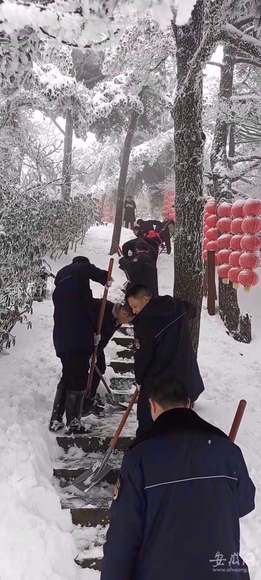 同时,派出铲雪车,组织8支铲雪突击队,明确分工,铲雪突击队分布景区各个重要旅游线路节点,齐心协力,铲雪除冰,清除彩虹公路两旁积雪压弯的枝条,清扫路面积雪。经过连日辛苦奋战,于2月8日13时全面贯通天柱山神秘谷_总关游线。
