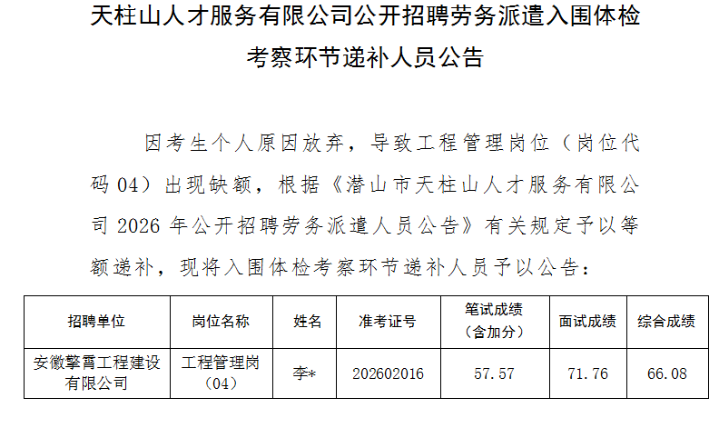 因考生个人原因放弃,导致工程管理岗位(岗位代码04)出现缺额,根据《潜山市天柱山人才服务有限公司2026年公开招聘劳务派遣人员公告》有关规定予以等额递补,现将入围体检考察环节递补人员予以公告:潜山市天柱山人才服务有限公司2026年3月18日